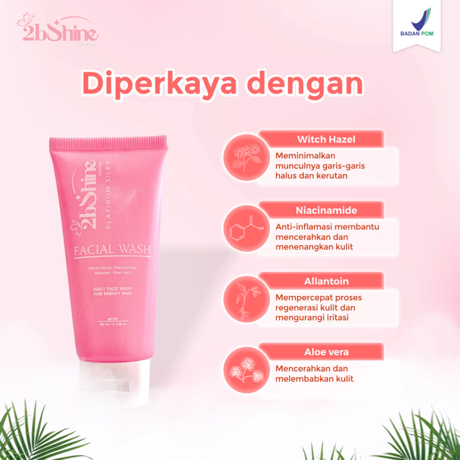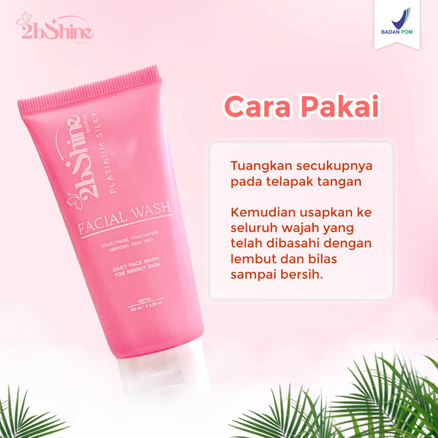 Bersihkan wajah Anda setiap hari dengan kelembutan 2bShine Platinum Silky Facial Wash. Sabun wajah ini diformulasikan untuk membantu mencerahkan kulit wajah yang kusam sambil membersihkan kotoran dan sisa makeup secara efektif. Mengandung bahan-bahan pembersih yang lembut dan bahan pelembap untuk menjaga kulit tetap halus dan terhidrasi setelah dibilas.