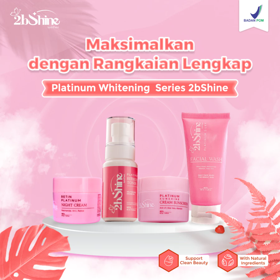 Gunakan seluruh rangkaian 2bShine Platinum Whitening Series secara rutin untuk hasil kulit cerah, lembap, dan sehat yang maksimal.